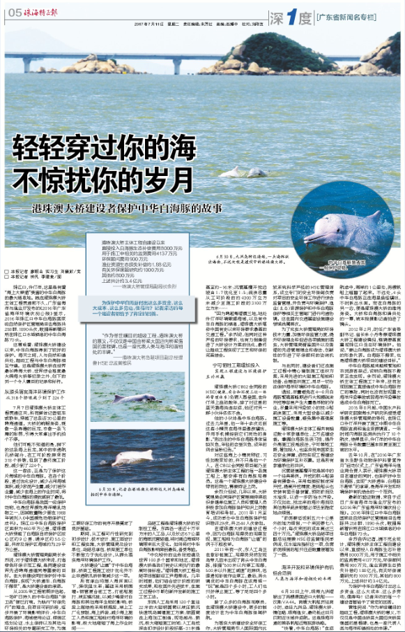 去年10月,在“2016年广东省水生野生动物保护科普宣传月”启动仪式上,广东省海洋与渔业局负责人表示,港珠澳大桥项目在建设的同时,也保护好中华白海豚,实现“大桥通车、白海豚不搬家”的承诺,是海洋开发和环境保护有机结合的一个范例。