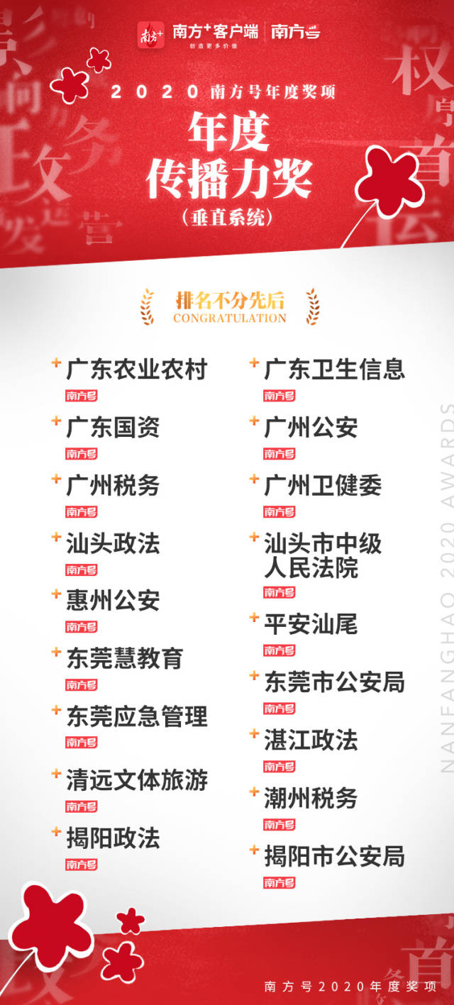 经过综合数据、专业评审团评委投票等多重选拔和考评后,南方号平台评选出年度最具影响力奖20个,年度传播力奖(系统)18个,年度传播力奖(地市)6个,年度传播力奖(区县)18个,年度政务公开奖16个,年度民生服务奖18个,年度最佳互动奖10个,年度最佳原创奖16个,年度权威首发奖8个,年度融媒创新奖12个,年度新锐奖6个,年度最佳运营者20名。